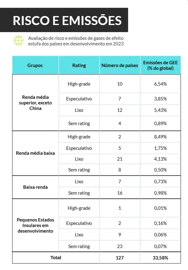 Os 27 países com classificação especulativa ou de grau de investimento — que inclui os grandes países de renda média alta, como Brasil, Indonésia, México e Colômbia, e alguns países de renda média baixa de maior porte, como Índia, Vietnã e Filipinas — são, de fato, responsáveis por nada menos que dois terços das emissões totais do mundo em desenvolvimento.