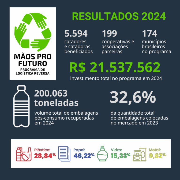 O Mãos Pro Futuro, programa pioneiro de logística reversa no Brasil, recuperou em 2024 cerca de 200 mil toneladas de embalagem pós-consumo, o equivalente a 32,6% da quantidade total de embalagens colocadas no mercado em 2023. Foi um aumento de 20%, comparado ao ano anterior.